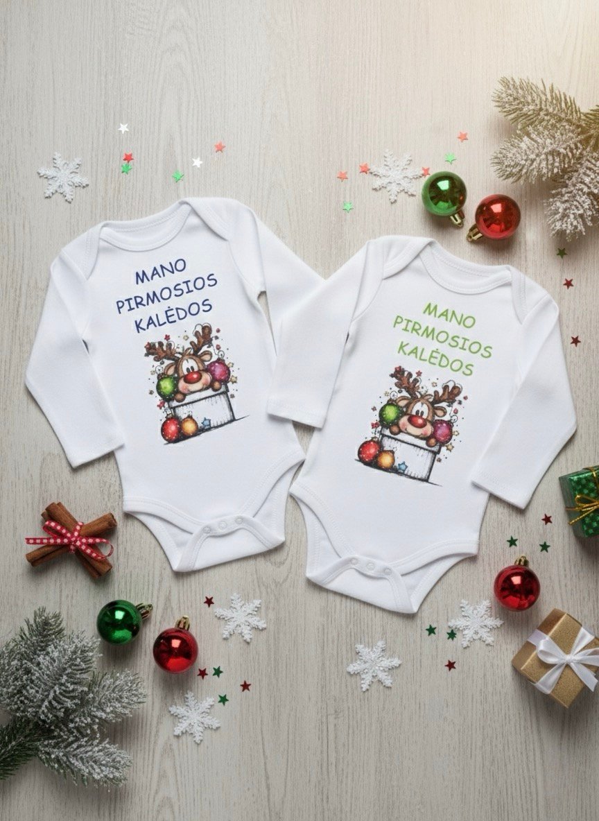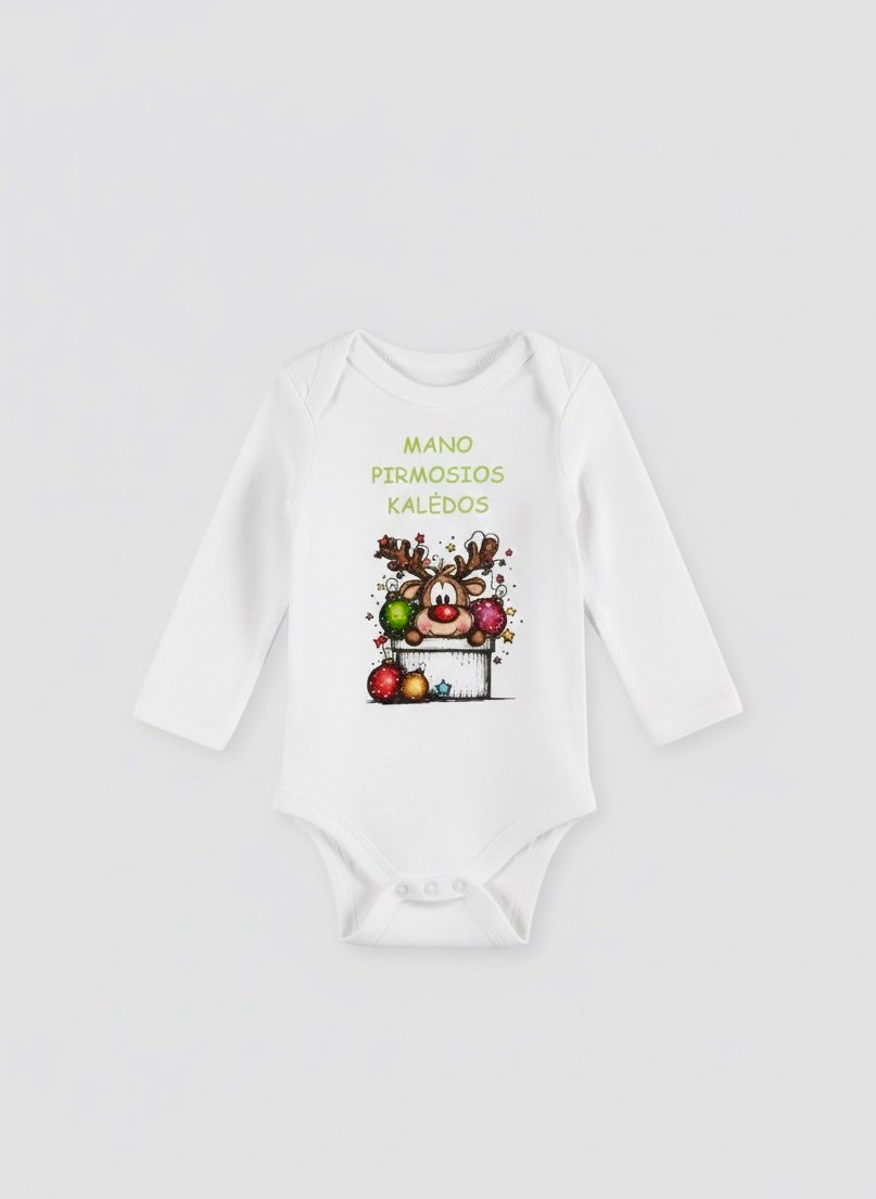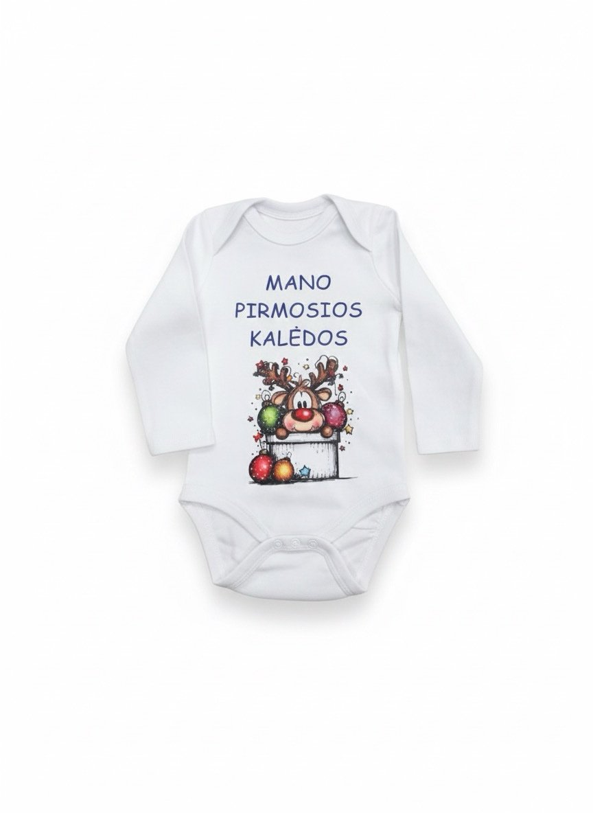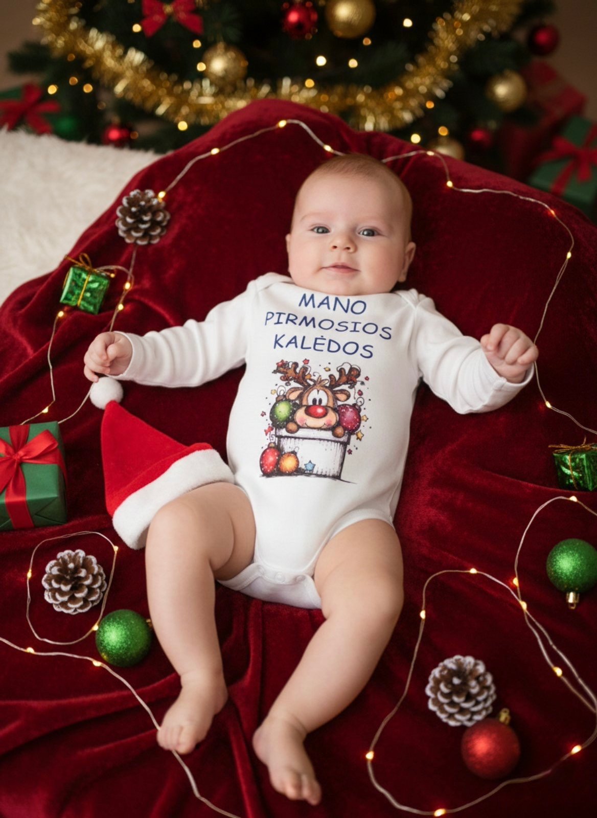 Baby romper (bodysuit) “My First Christmas” (text in lithuanian) – the perfect outfit for your baby’s first holiday.