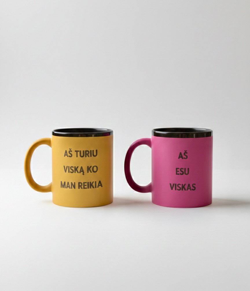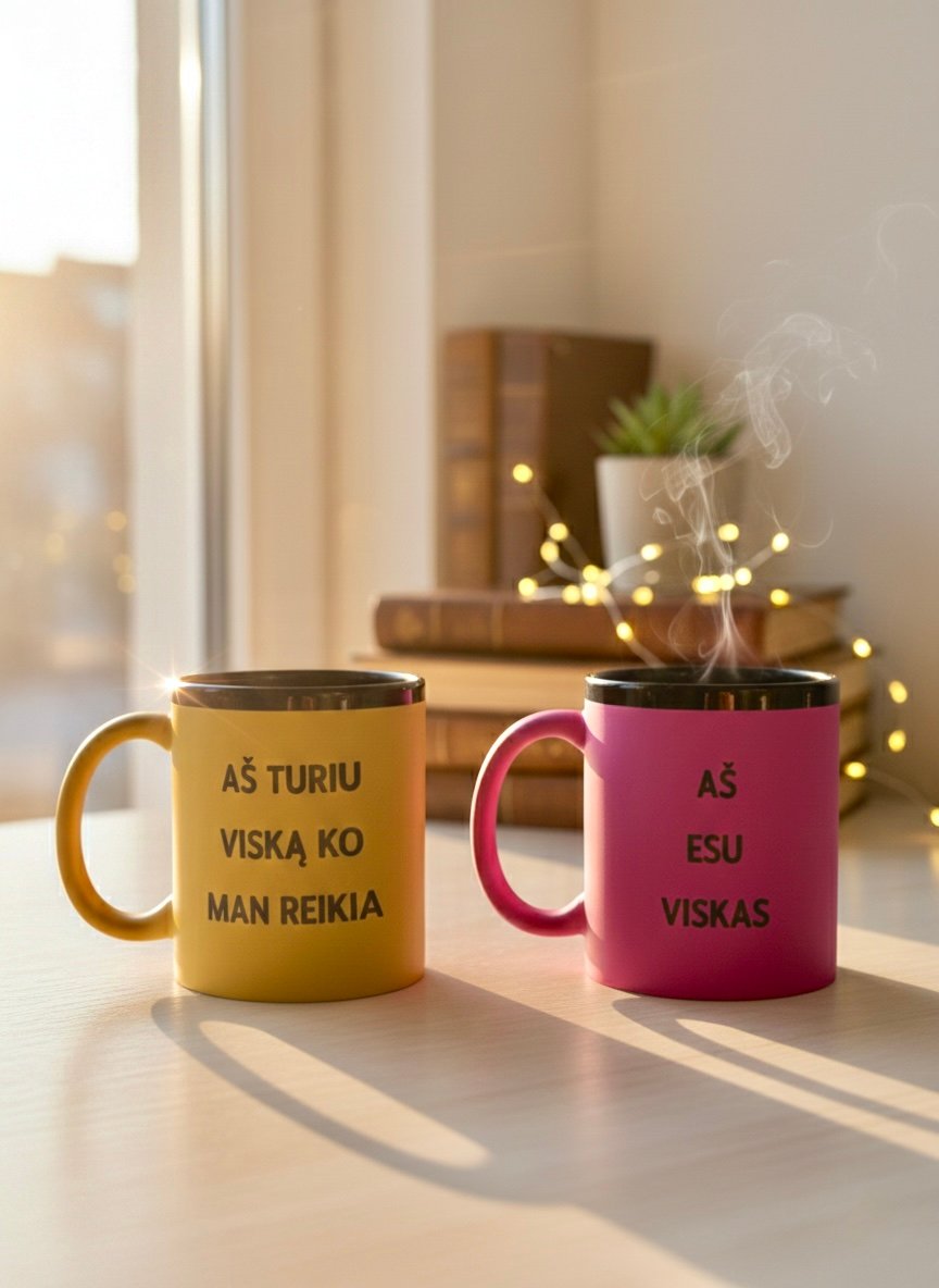 This couple mug set is designed to make your daily coffee or tea moments even cozier and more fun. The two mugs, engraved with “I Have Everything I Need” and “I Am Everything,” subtly and playfully express connection, closeness, and warm humor. The inscriptions are in Lithuanian. If you would like the texts in a different language, please contact us.