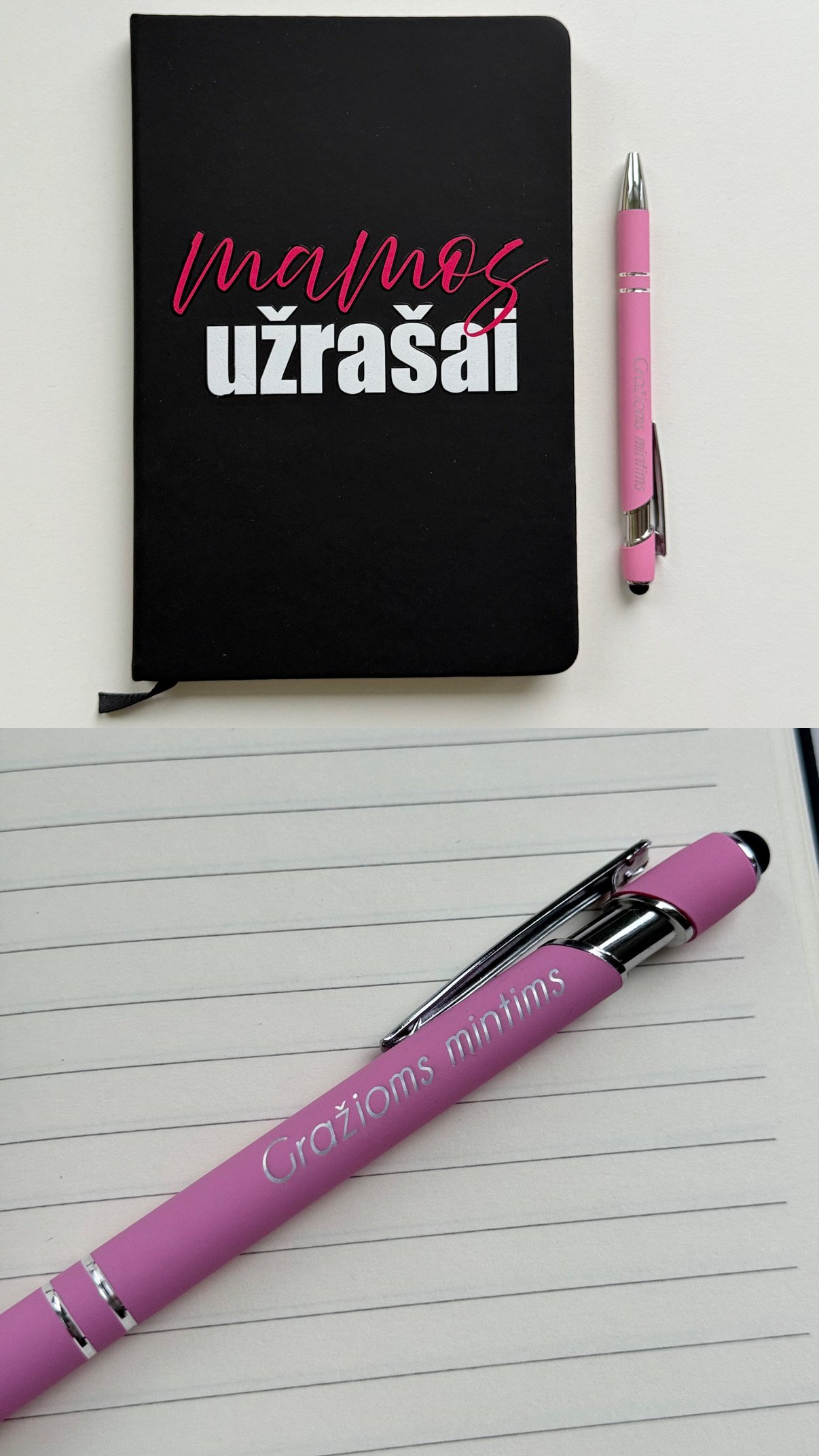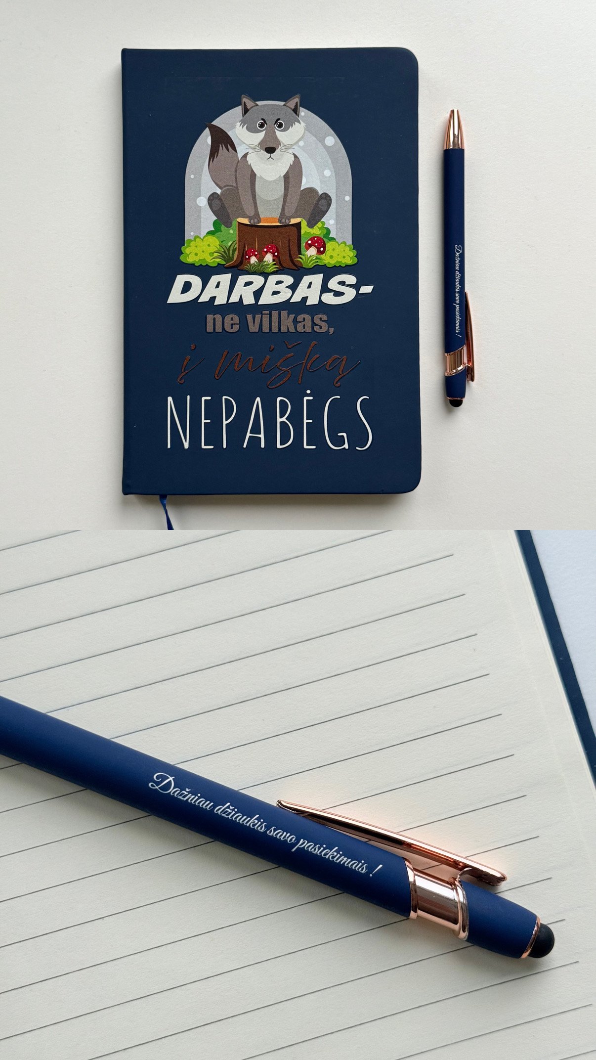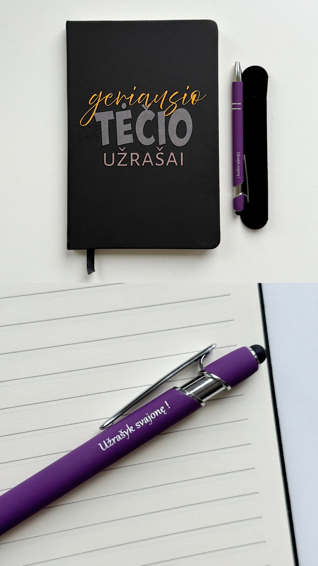 Notebooks with colorful phrases and engraved pens, made in our workshop. They make a great gift that can be used every day.