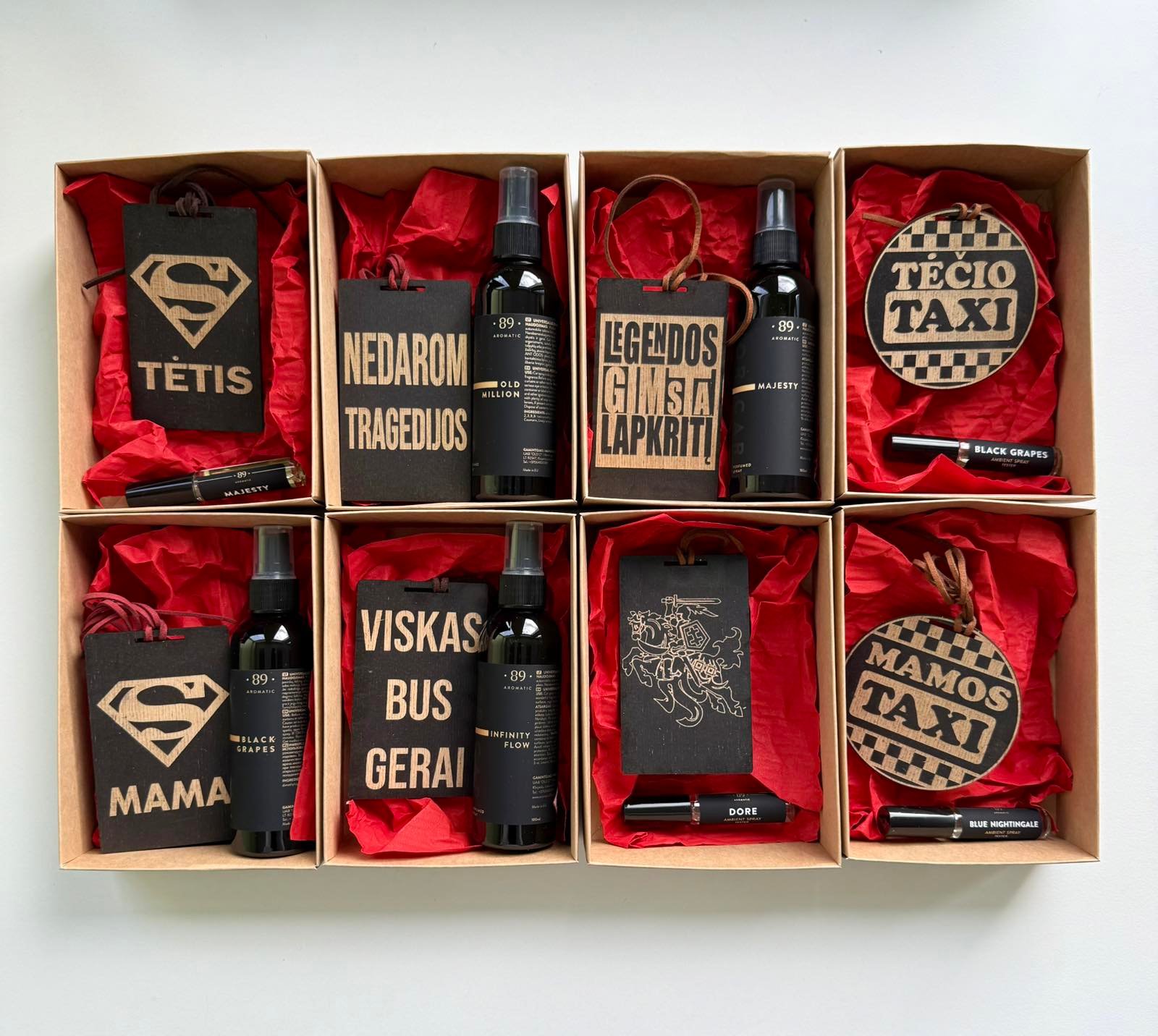 Išskirtinis automobilio kvapo rinkinys su mūsų jaukiose dirbtuvėse gaminta medine kvapo kortele su linksmais ir įkvepenčiais graviruotais užrašais. Šį automobilių kvapų rinkinį specialiai paruošėme su testeriu, kad galėtumėte išbandyti kvapą prieš pasirinkdami savo favoritą. Jei jau turite mėgstamą aromatą, jį patogiai rasite čia.