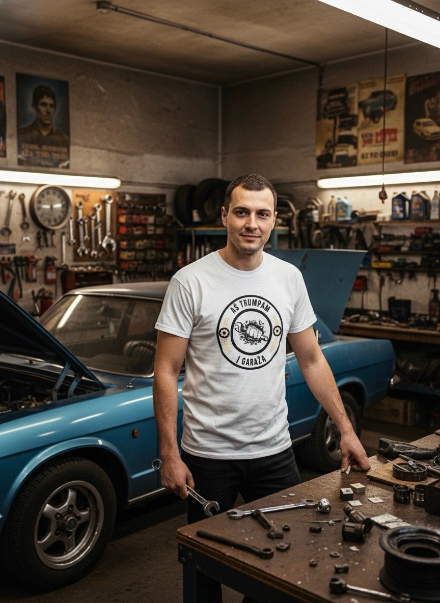 Ryškus, kontrastingas užrašas ir iliustracija iškart atkreipia dėmesį ir aiškiai perduoda žinutę. Dizainas subalansuotas taip, kad marškinėliai tiktų tiek kasdieniam nešiojimui, tiek laisvalaikiui ar darbams garaže.