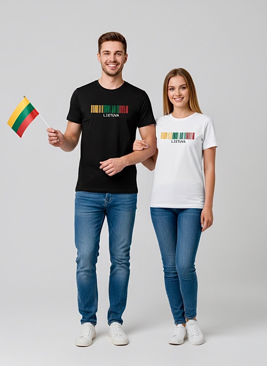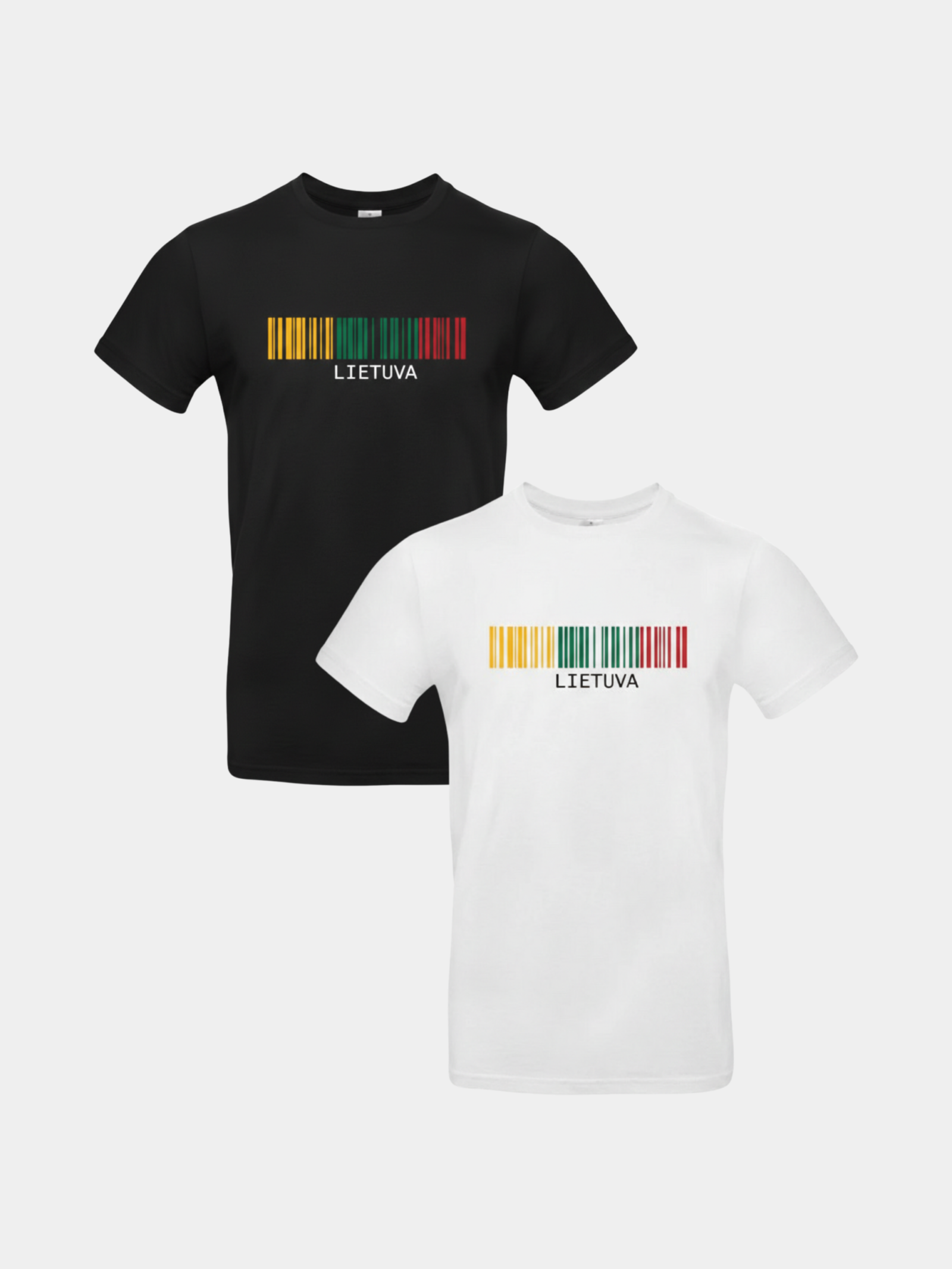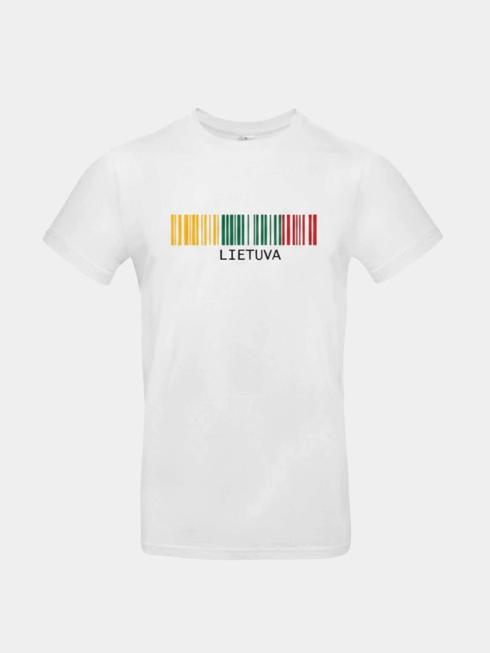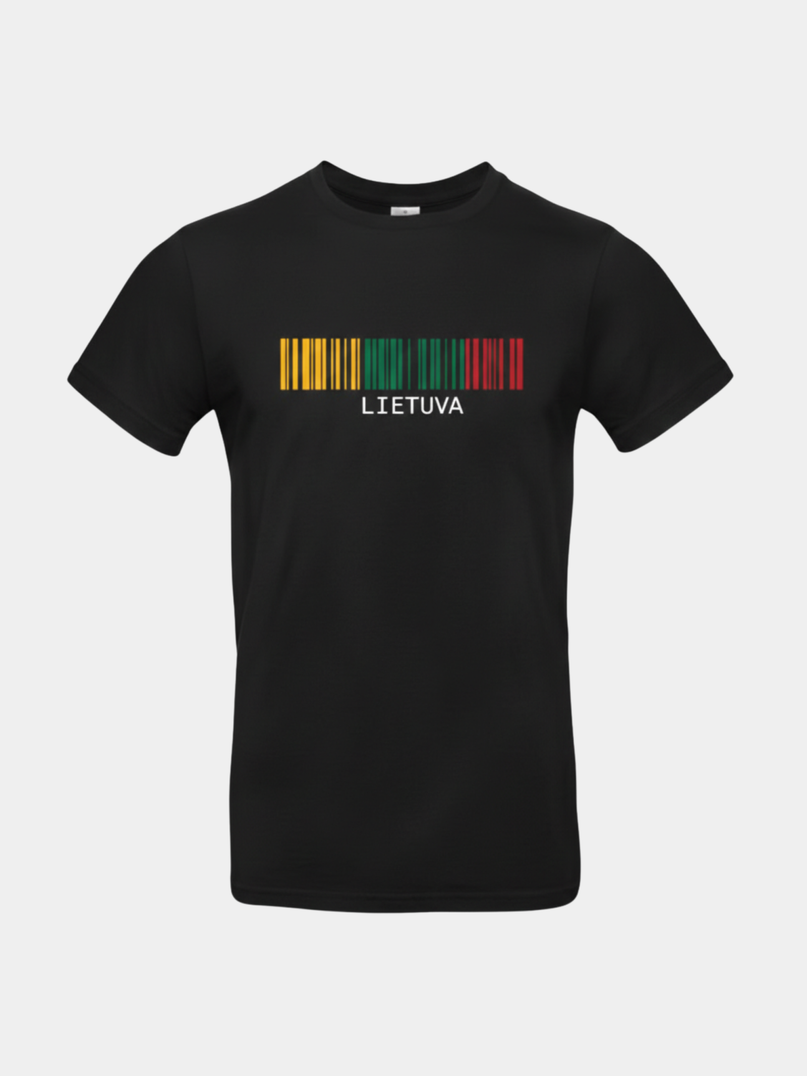 Marškinėliai su Lietuvos trispalvės spalvų barkodo spauda ir užrašu „Lietuva“. Tai marškinėliai, kuriuos galima dėvėti kasdien – mieste, renginiuose, kelionėse ar kaip stilingą patriotizmo detalę.