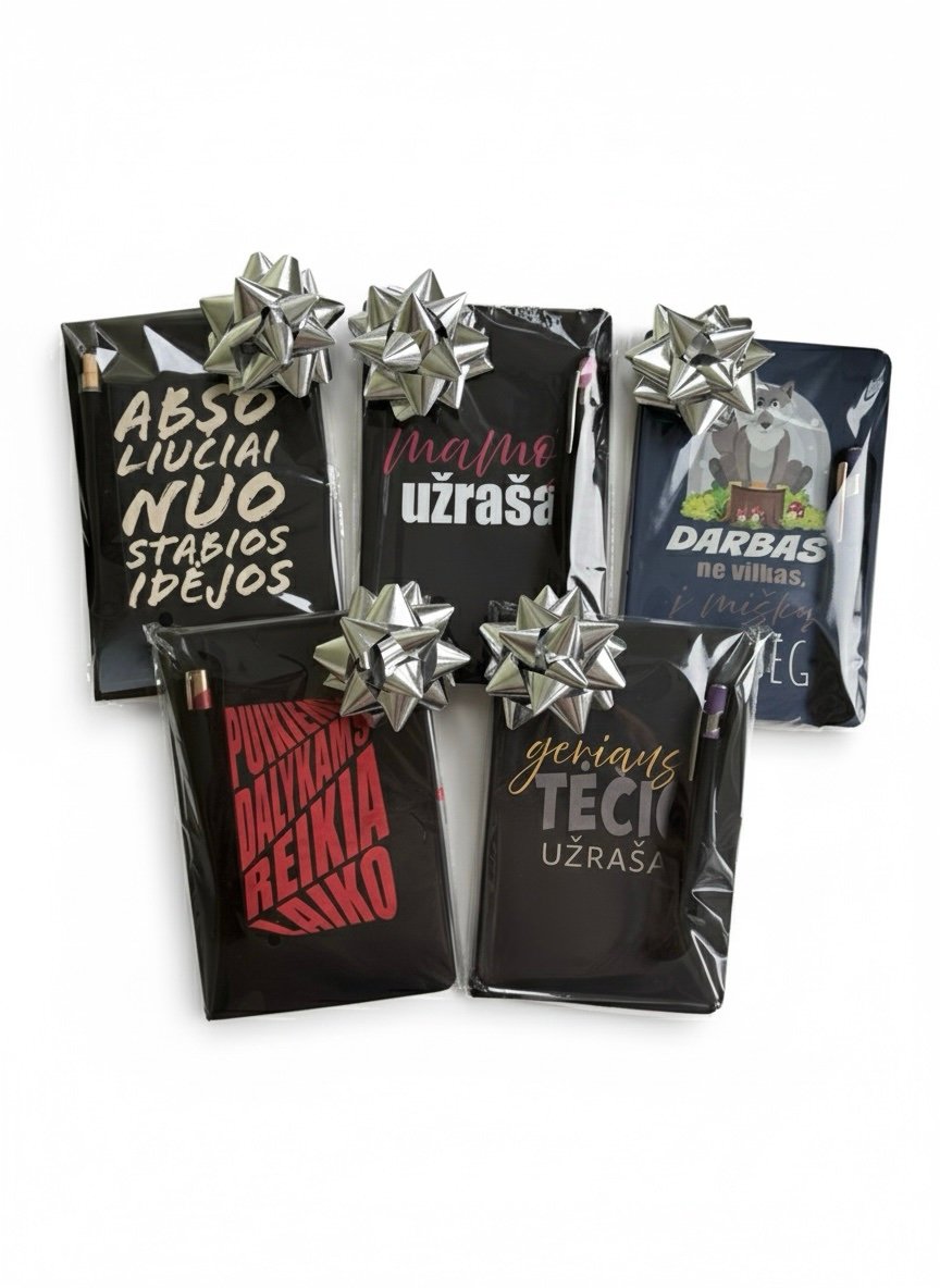 Užrašų knygutės su spalvingomis frazėmis ir graviruoti tušinukai, pagaminti mūsų dirbtuvėse. Tai puiki dovana, kuri bus naudojama kasdien.